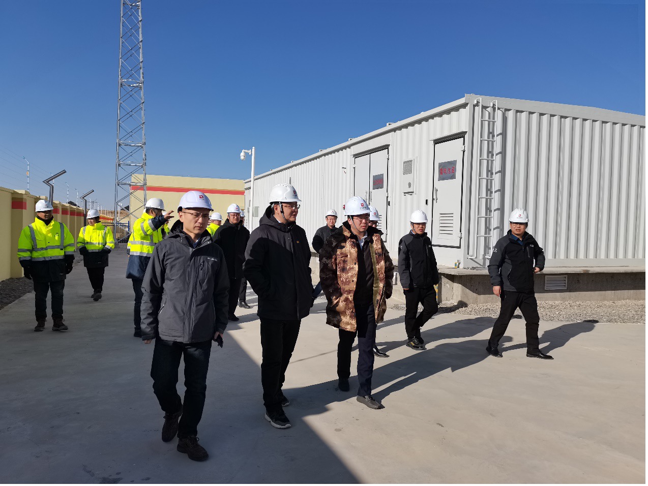 随后,项目部负责人带领视察组巡检了升压站及光伏厂区,详细介绍了升压站、集控室、光伏发电站厂区及箱变等情况。视察组要求严格落实电站厂区每一处细节工作,确保工程质量和人身财产安全,并对奋战在一线的工作人员进行亲切慰问。